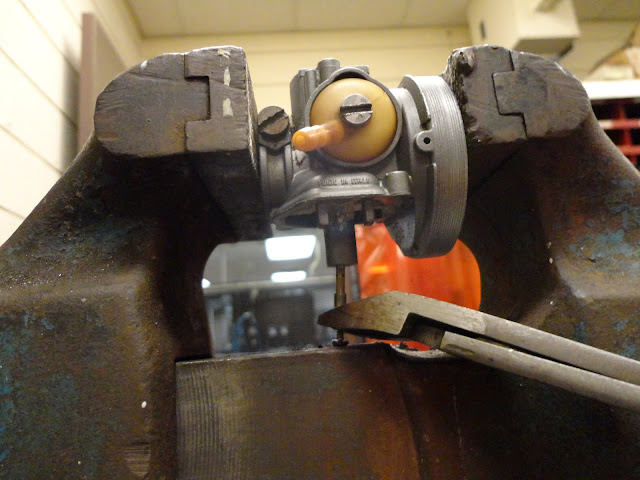 Grab a blow torch, propane is fine. You could probably put the whole dinghus in the oven too, but it might smell like varnish gas or kill you or something. Here I am using team overkill to very lightly flick the bottom of the jet snorkel thing with some heat. The carb is some bogus zinc/aluminum/matchbox car crap metal so it will melt pretty easily.